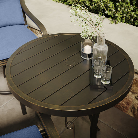 - Bar Height Tables: Bar-height tables tend to have a smaller surface area and may be a few inches higher than counter-height tables. This makes them an excellent choice for intimate terraces or smaller outdoor spaces. Create a vibrant pub-style atmosphere on your patio with a bar height table such as our Agio 33" Round Slat Top Bar Table. You can buy a single piece or settle for a bar set like the Napili 3 Piece Bar Set for an expertly selected unified look.