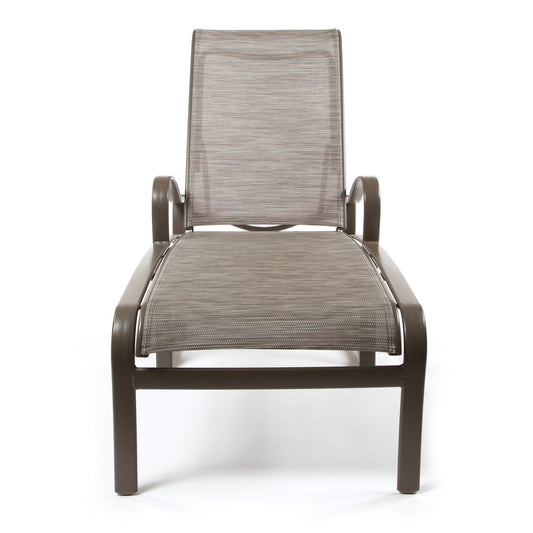 Tropitone's Shoreline sling collection has a powder coated aluminum frame that effortlessly flows from its big rounded arms to its outdoor safe beautiful sling fabric.