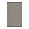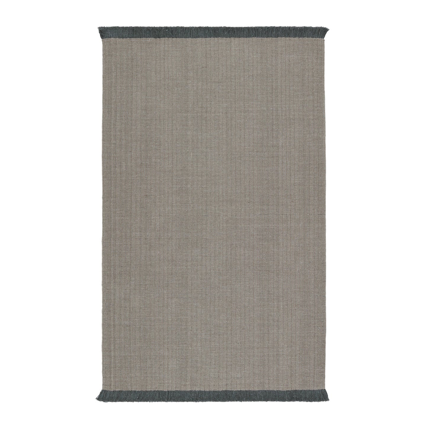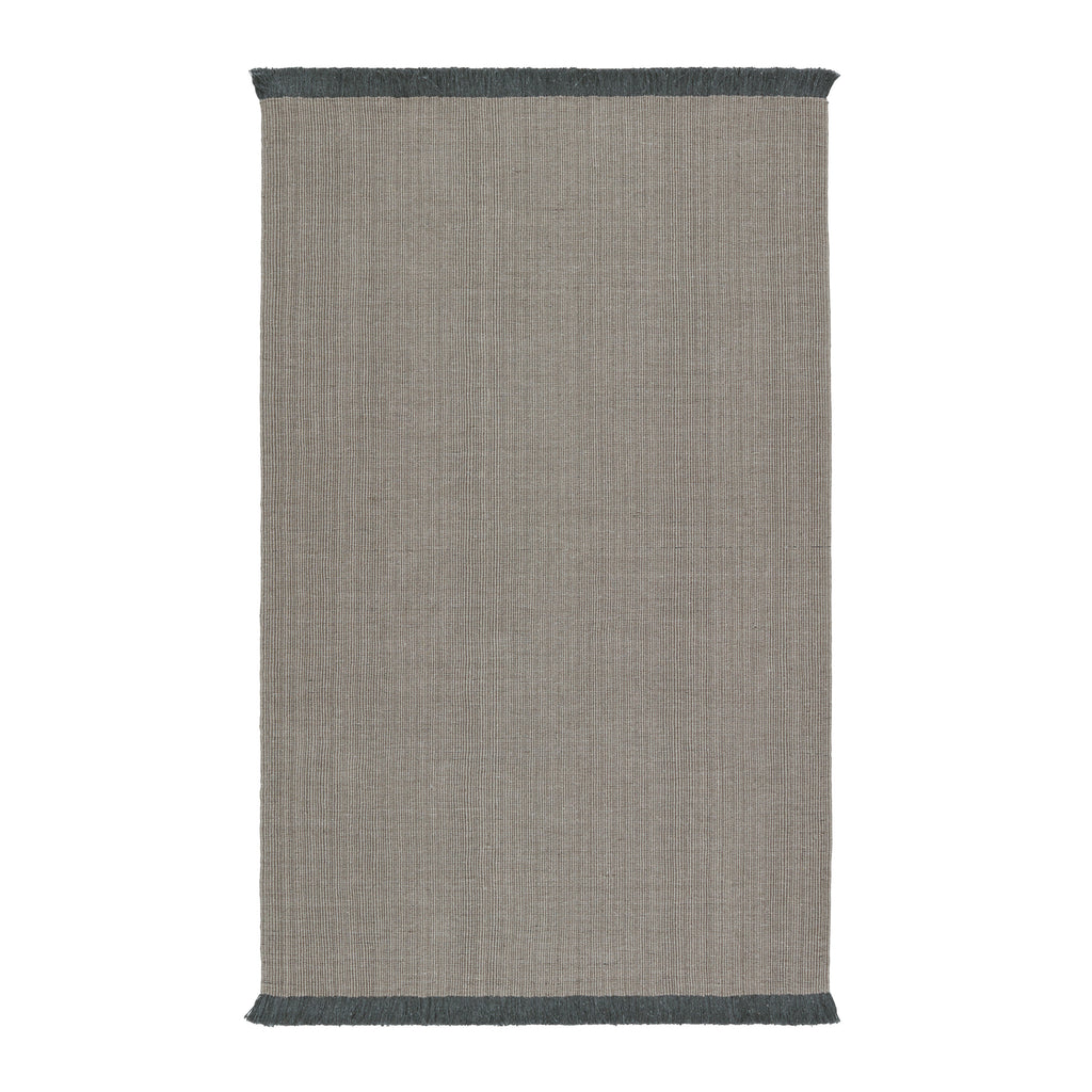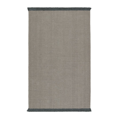 - The Engild area rug features a solid light gray pattern with linear striations and a complementary dark gray fringe.