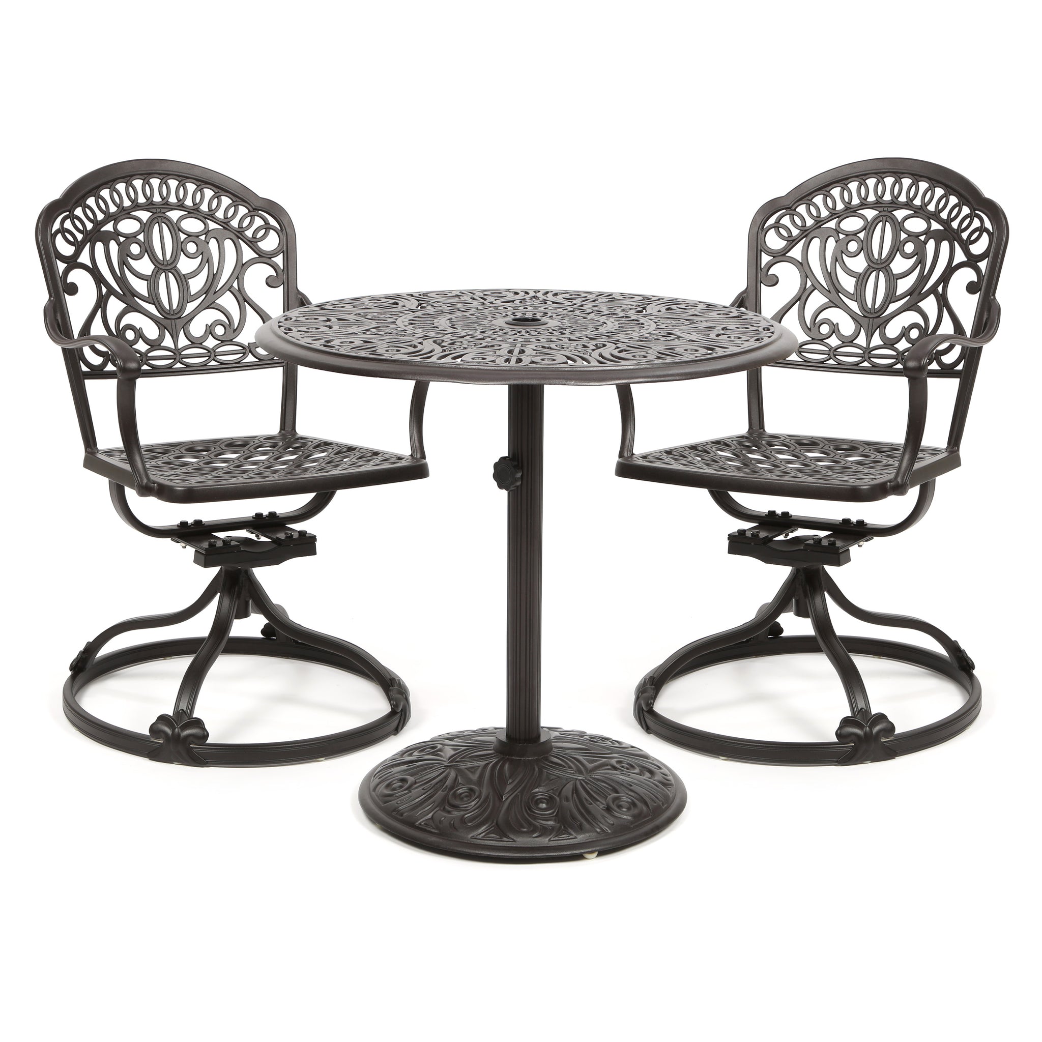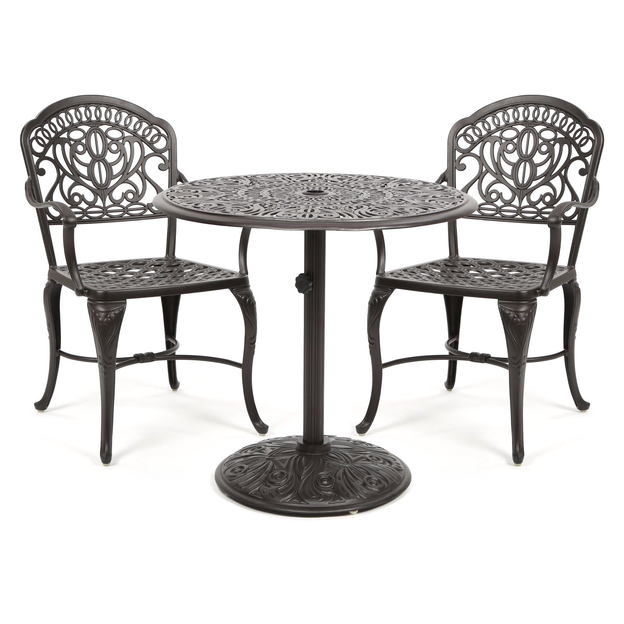 - Set includes: 30" round table with 50 lb. umbrella base and choice of dining chairs.